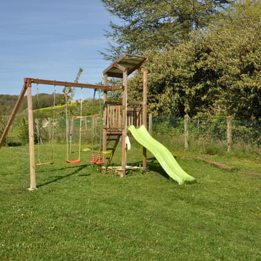 Aire de jeux dans le jardin avec toboggan, balançoires et bac à sable